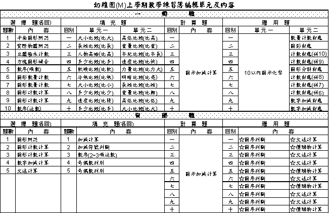 1.幼稚園(M)上學期數學模擬試題之單元、內容